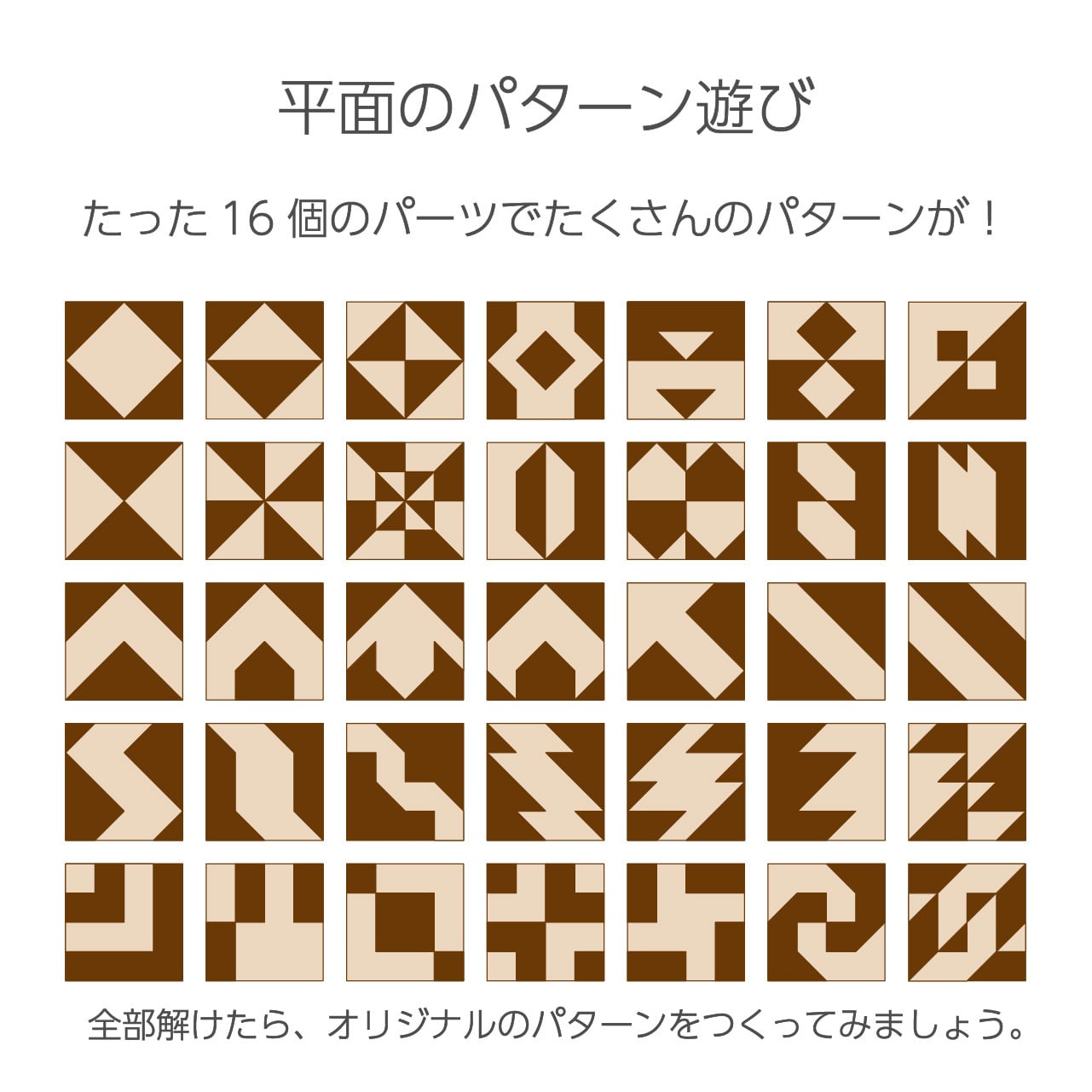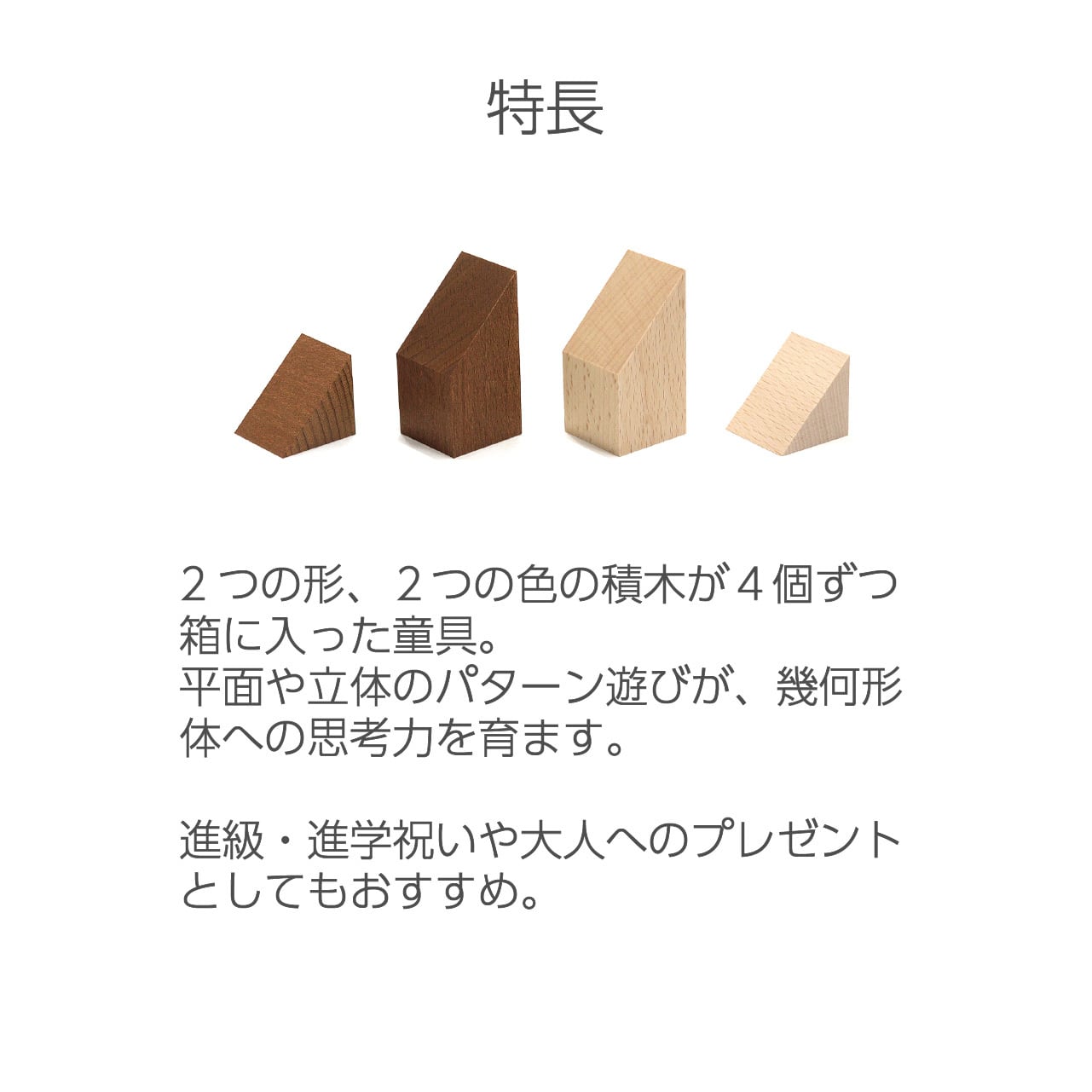 平面と立体のパターン遊びの展開が可能です。進級・進学祝いや大人へのプレゼント、また携帯用の積木としても重宝できます。