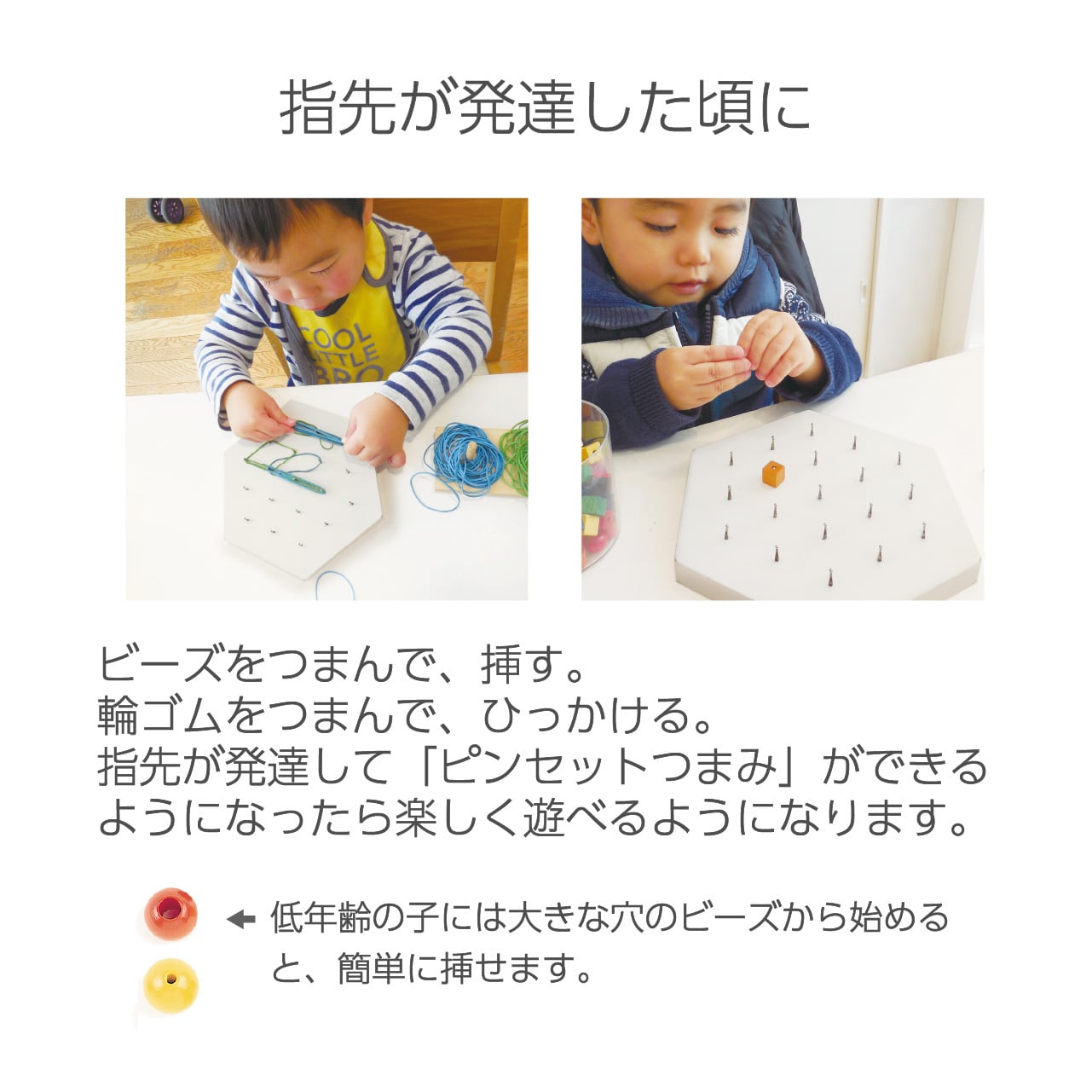 指先が発達して「ピンセットつまみ」ができるようになったら楽しく遊べるようになります。